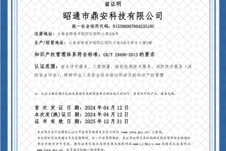 2003年11月10日,昭通市鼎安科技有限公司成立,初始主要從事第三方安全工程技術(shù)服務,經(jīng)多年運營,發(fā)展為多專業(yè)綜合科技平臺,為社會提供多種專業(yè)技術(shù)服務工作。 現(xiàn)公司注冊資金為1200萬元,公司法定代表人:毛衛(wèi)旭。公司主要業(yè)務:安全評價、安全標準化評審、安全工程技術(shù)服務;環(huán)境監(jiān)測、職業(yè)衛(wèi)生檢測、檢驗;法律訴訟及非訴訟服務;司法鑒定、固定資產(chǎn)投資項目節(jié)能服務;工程咨詢;工程測量測繪;安全教育培訓等。是安全生產(chǎn)服務、安全教育培訓機構(gòu),也是環(huán)境監(jiān)測和職業(yè)衛(wèi)生服務機構(gòu),同時也是綜合的檢測檢驗、綜合科技平臺服務機構(gòu)。多年來為公、檢、法、司、軍、警、海關(guān)、仲裁、安監(jiān)、工礦商貿(mào)企業(yè)、社會團體及個人提供多專業(yè)技術(shù)服務。